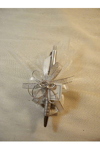 Caneta decorada com uma trouxa com sabonete, um lindo laço em branco e prata e um elegante par de alianças nos tons prata.
