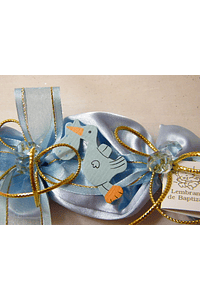Rebuçado em tecido azul com sabonete, decorado por laço em fita azul com fios dourados, pedras azuis e um elegante fio dourado. Ainda uma cegonha com saquinho na boa em folha de madeira também em azul.