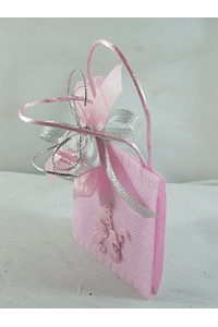 Saco em tecido rosa, a imitar uma mala, decorado por um lindo laço com fita cor-de-rosa e fita prata. A adornar o laço, uma linda chupeta acrílica também em rosa. No interior do saco, um sabonete.