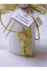 Vela branca de formato cilíndrico em saco organza, decorado por lindo laço com fitas douradas brilhantes e fitas brancas com pormenores em dourado, ainda um lindo fio em cor ouro. A adornar o arranjo, temos um ostensório numa das pontas das fitas do laço e, mesmo no centro do laço, temos um pão e uma hóstia.