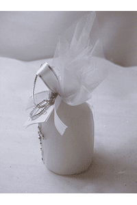 Saco de orelhas em tule translúcido, decorado por um lindo laço de fitas brancas com pormenores prata e um fio elegante na cor cinza. Ainda ao centro do laço uma pedra brilhante a transmitir a ideia de uma pedra preciosa. Temos também uma cruz em Strass prata no tule.