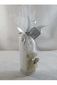 Trouxa em organza com vela quadrada alta, decorado por um lindo laço com fita prata e fita branca com apontamentos prata, ao centro strass prata. Ainda no centro da vela um saco em resina e ao fundo, em todo o seu contorno, strass prata.