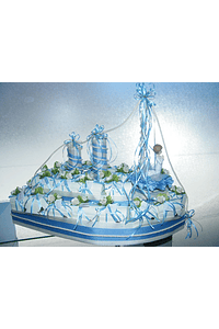 Estrutura de barco em esferovite forrado com fitas e cordão na cor solicitada, decorado com boneco a condizer com o evento festivo.