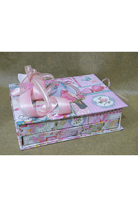 Guarda joias em cartão duro 25x19x6,5cm, tema " periquito", com 300gr de bombons deliciosos. Decorado nos tons de cor de rosa.