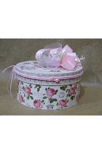 Caixa redonda grande O 19cm x10cm em cartão duro tema " vintage" , recheada com 500gr de bombons. Decorado com fita fita setim e organza cor de rosa, folhas tecido branca e pequenas flores.