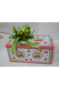 Lata retangular tema " Cerejas " 175x104x85 mm, com 300gr de deliciosos bombons. Decorada com fitas em em tons de verde e frutos.