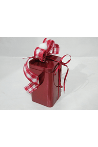 Caixa alta 59x59x96mm em metal vermelho, com 80gr de deliciosos bombons. Decorada com fitas tecido nos tons vermelho e branco.