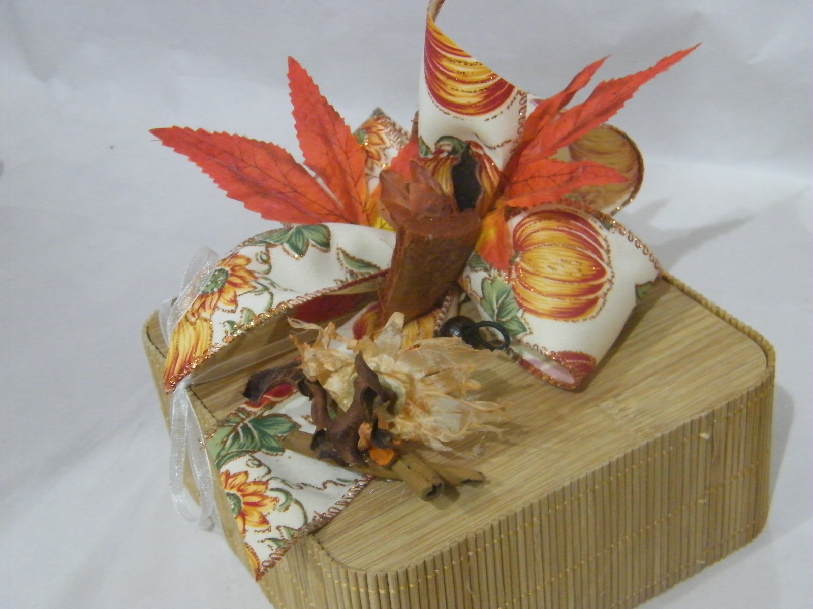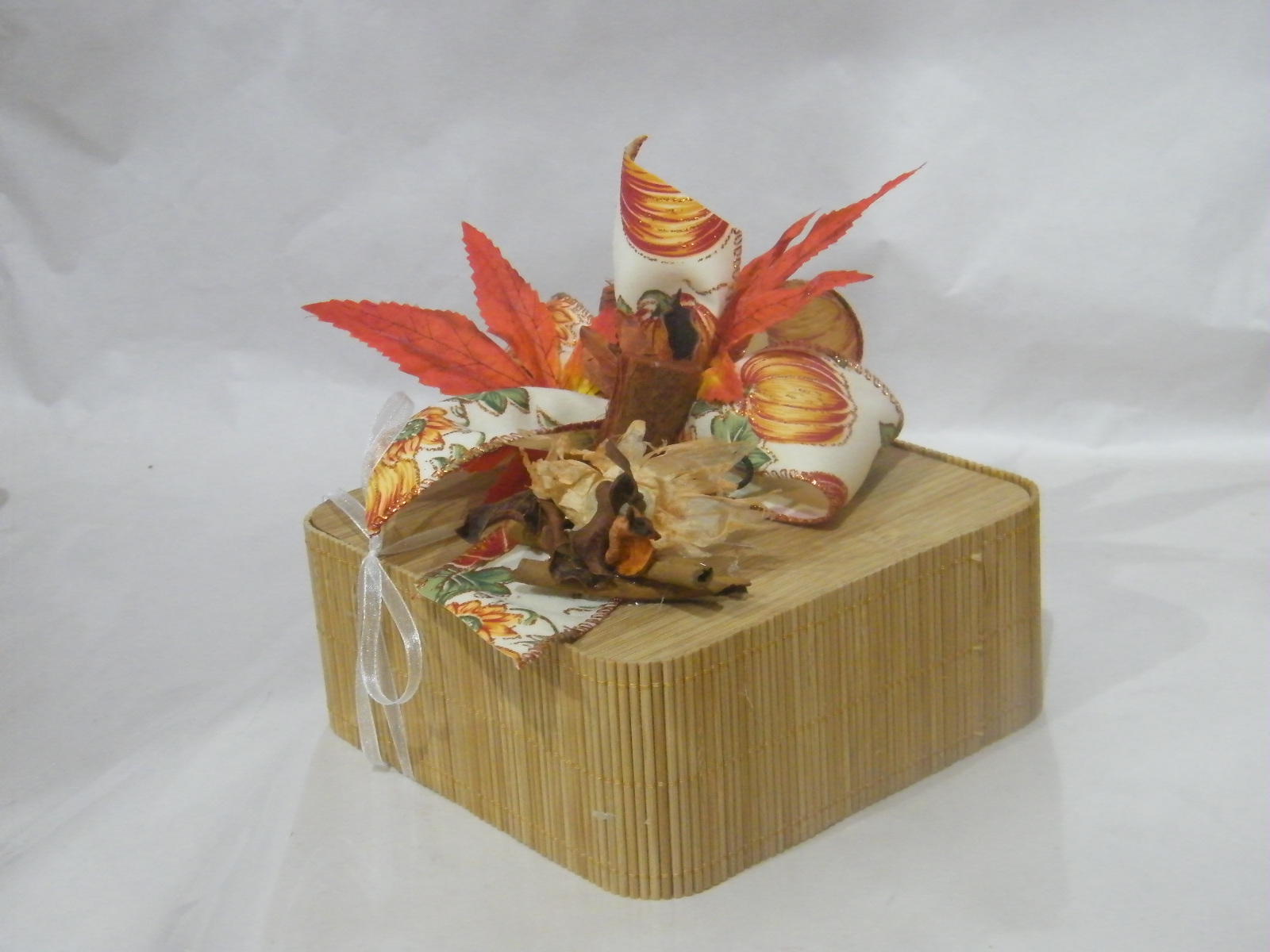 Caixa em bambu quadrada (14cm x 14cm x 6cm), recheada com 250gr de maravilhosos bombons, decorada com bonito arranjo outonal composto por um pomposos laço em fitas tecido estampado tema aboboras, folhas e flores secas.