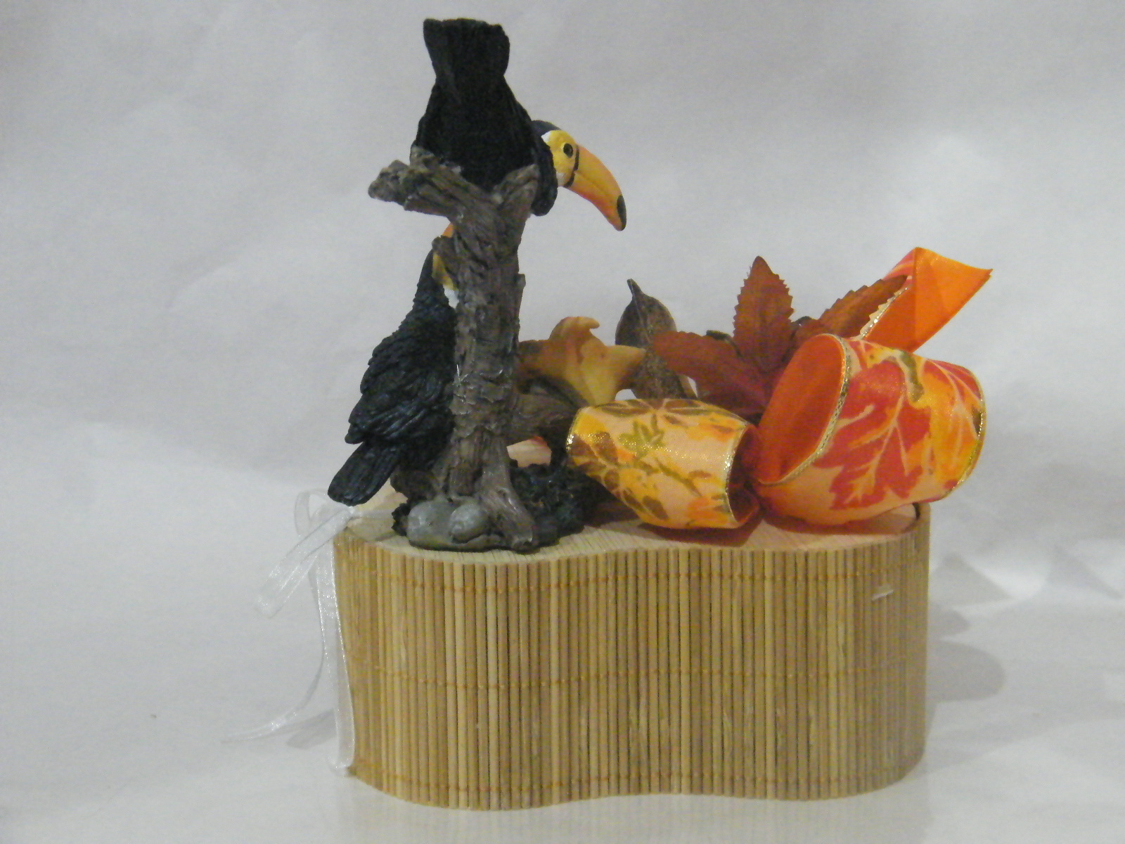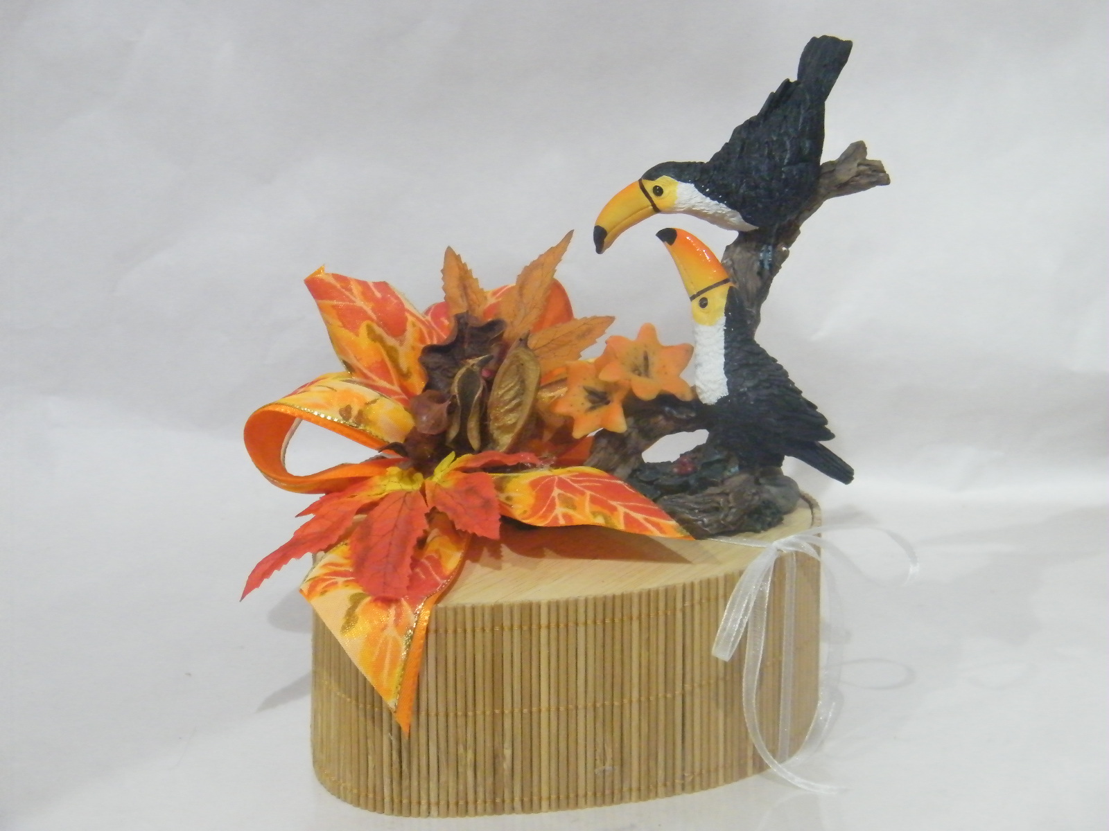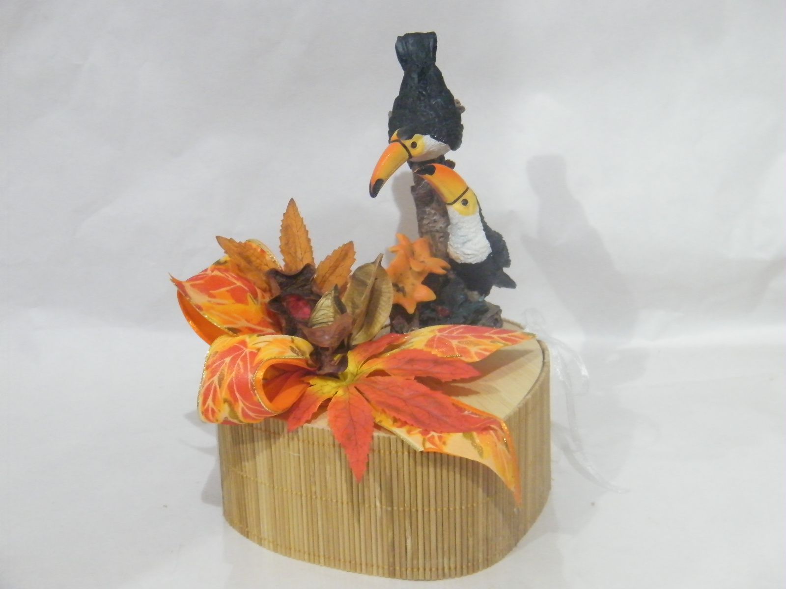 Caixa de bambu em foma de coração (15cm x 6cm), recheada com 200gr de maravilhosos bombons, decorada com bonito arranjo outonal composto por um pomposos laço em fitas tecido estampado tema outono, folhas, flores secas e tucanos em cerâmica.