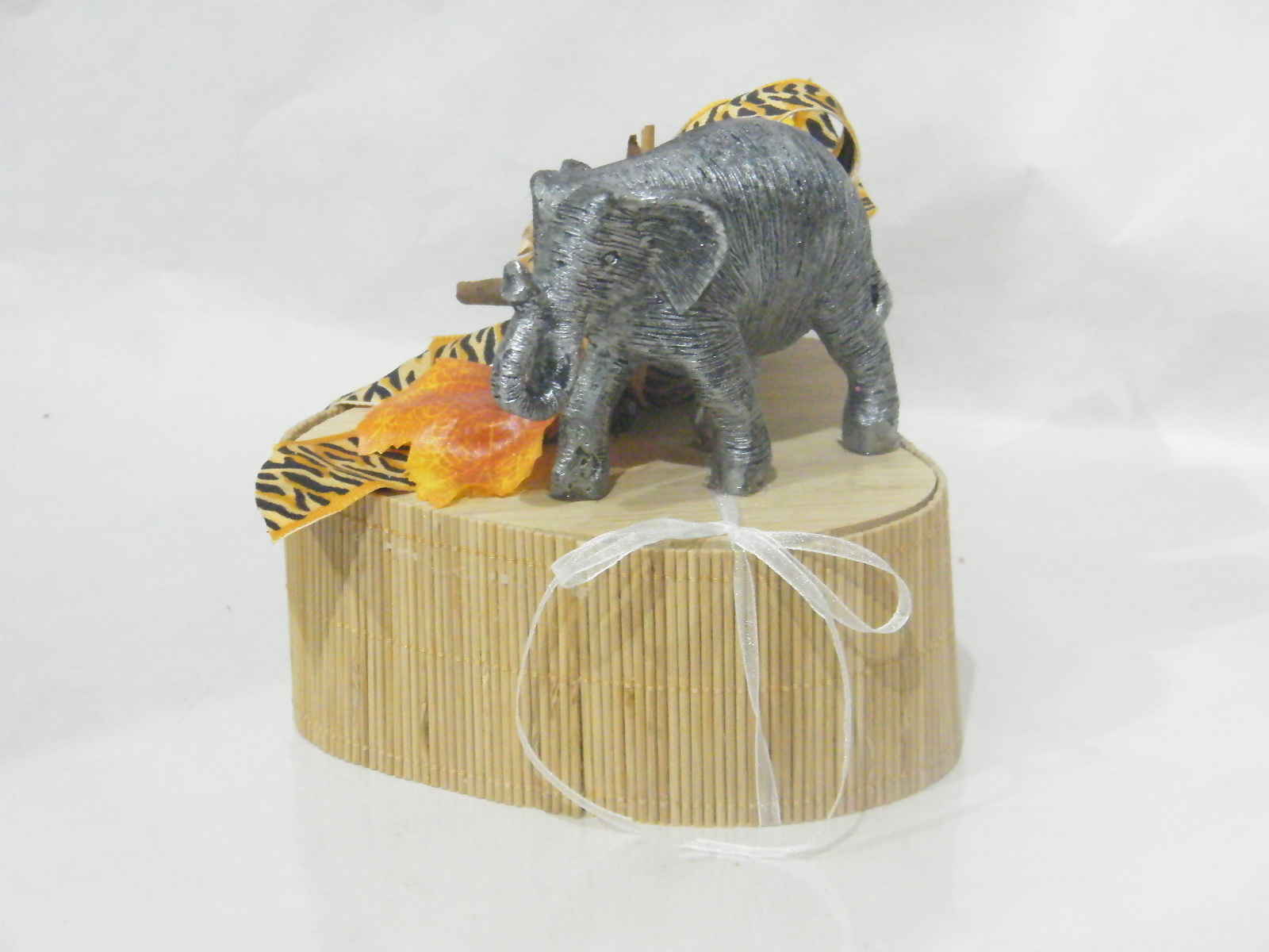 Caixa de bambu em foma de coração (15cm x 6cm), recheada com 200gr de maravilhosos bombons, decorada com bonito arranjo outonal composto por um pomposos laço em fitas tecido estampado tema savana, folhas pau canela e elefante em ceramica.