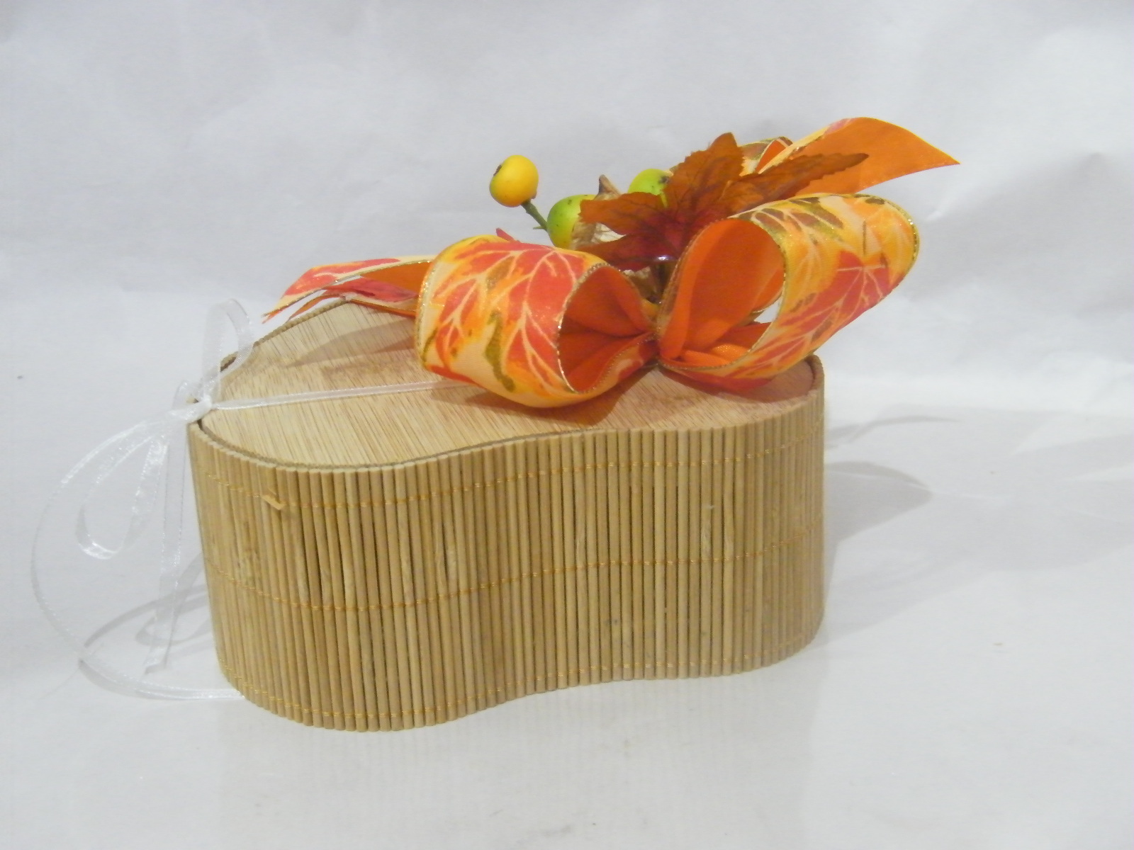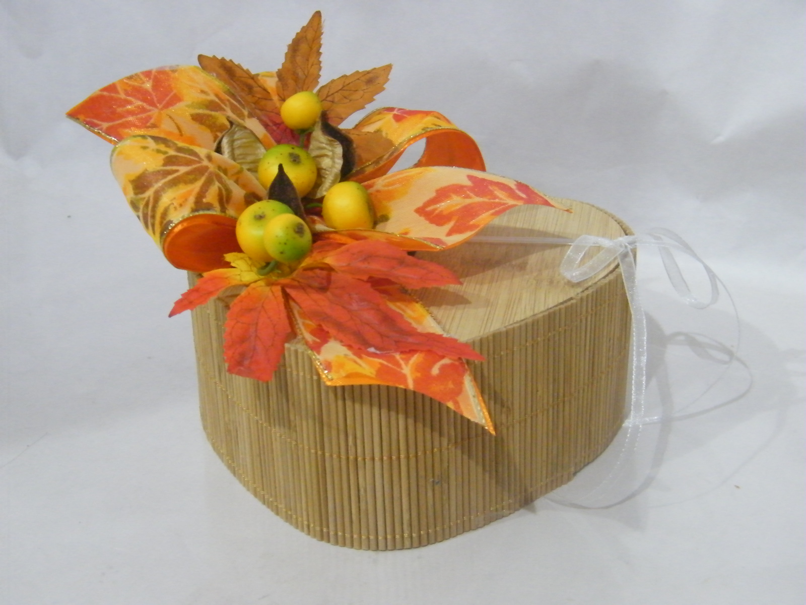 Caixa de bambu em foma de coração (15cm x 6cm), recheada com 200gr de maravilhosos bombons, decorada com bonito arranjo outonal composto por um pomposos laço em fitas tecido estampado tema folhas de outono, folhas e fruta.