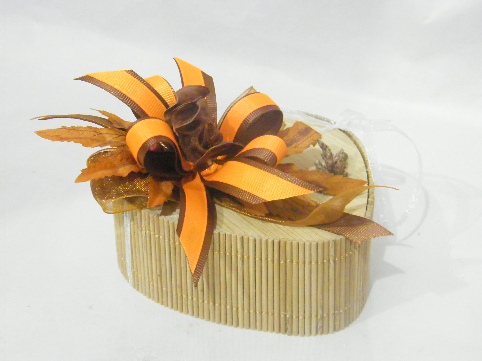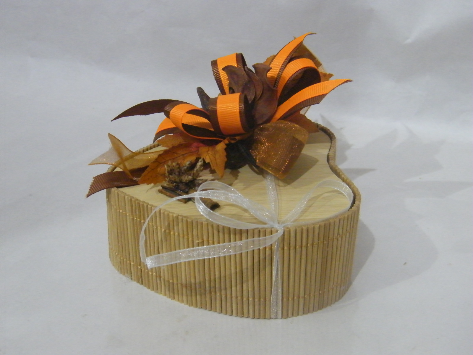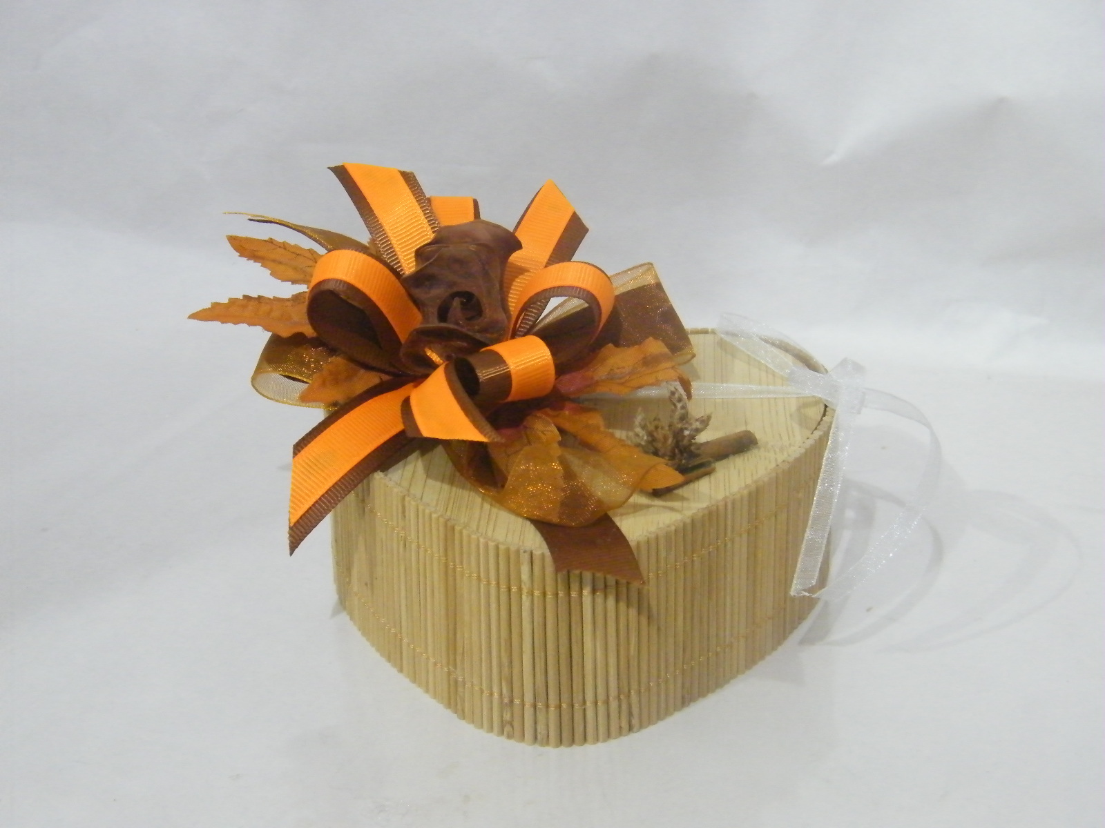 Caixa pequena de bambu em foma de coração (11cm x 4cm), recheada com 100gr de maravilhosos bombons, decorada com bonito arranjo outonal composto por um pomposos laços em fitas tecido e organza nos tons castanho e laranja, folhas e flores secas.