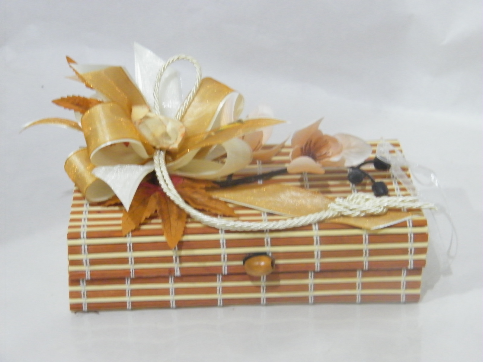 Caixa em bambu retangular media (19cm x 10cm x 5cm), recheada com 200gr de deliciosos bombons, decorada com bonito arranjo outonal composto por um pomposos laço em fitas setim e organza nos tons beije e castanho, laçada em cordão perola, folhas e flores de tecido.