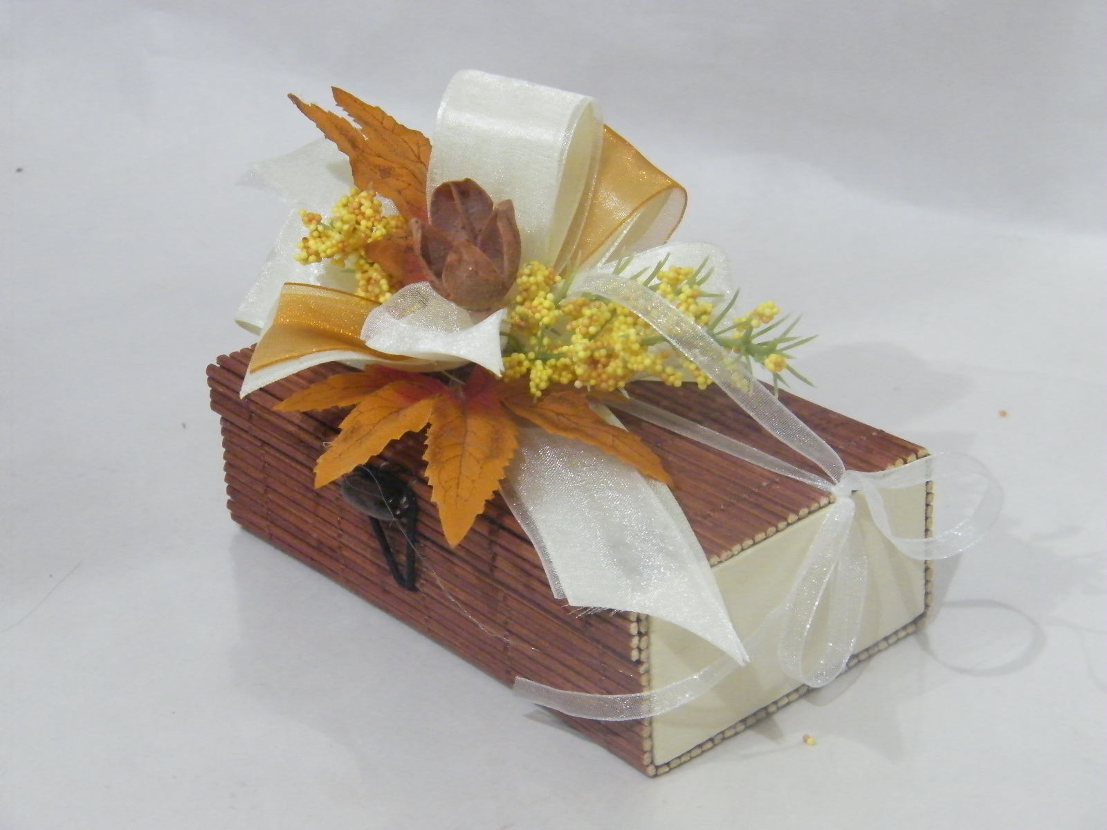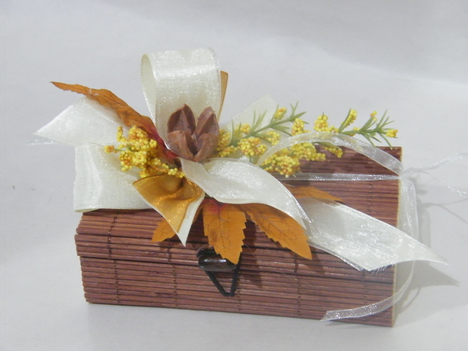 Caixa em bambu castanho retangular pequena (12.5cm x 7cm x3.5cm), recheada com 100gr de deliciosos bombons, decorada com bonito arranjo outonal composto por laços em fitas setim perola e fitas organza nos tons castanho e perola, folhas e flor seca.