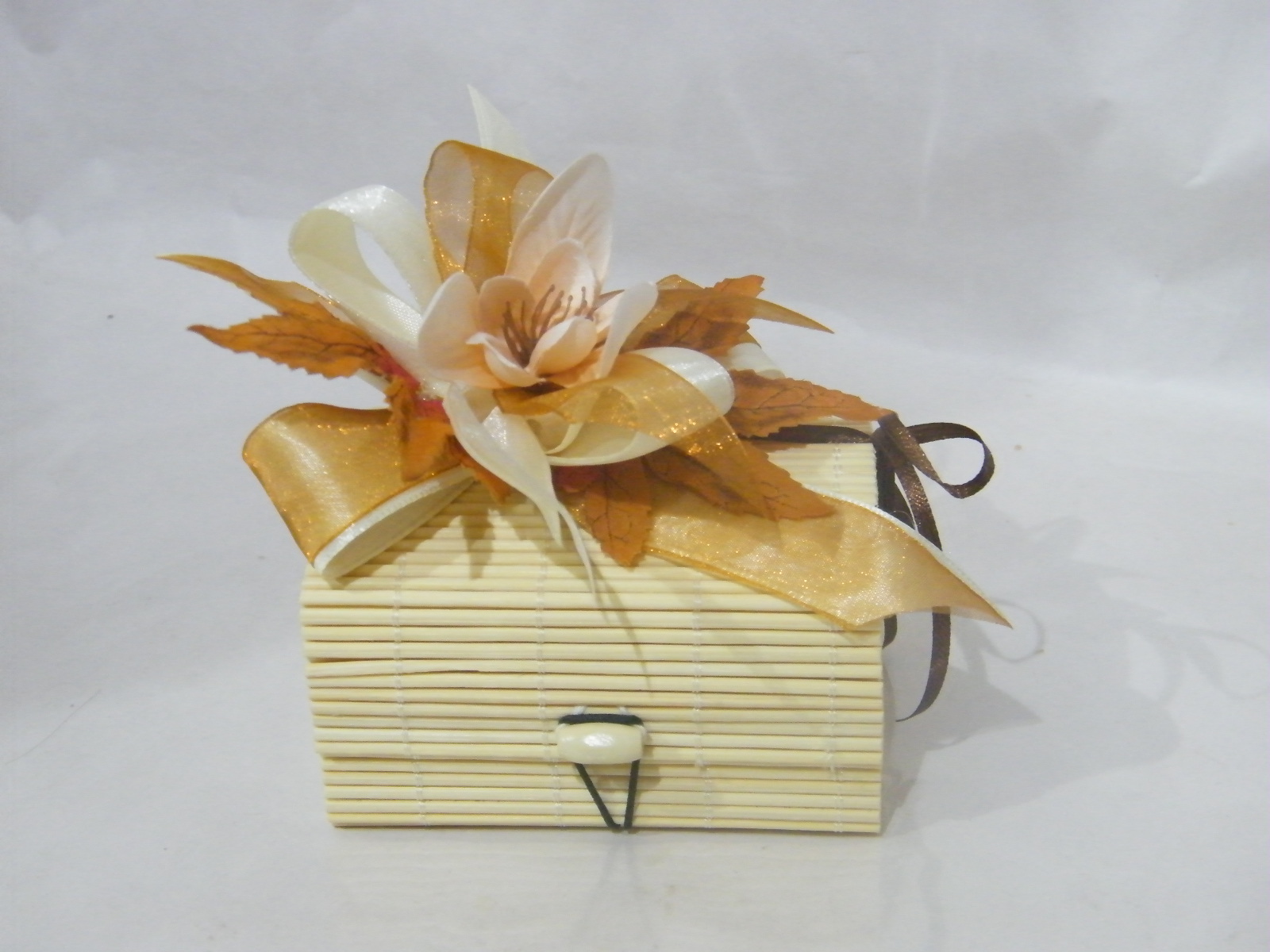 Bonito baú em bambu (10cm x 7cm x 6cm), repleto com 100gr de deliciosos bombons. Decorado com laços em fitas setim e organza nos tons perole a castanho e um lindo arranjo artificial de folhas e flor sobre o laço.