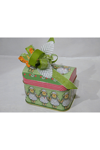 Bau metal " Molly" 105x78x60mm, com 200gr de deliciosas amêndoas. Decorado em tons de verde e branco.