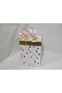 Bonita caixa grande em cartão tema pintas rosa 13x13x18,2cm, recheada com 900gr de deliciosas amêndoas. Decorada com lindo laço gravata em fitas tecido nos tons cor de rosa e branca bolinhas rosa, um pequeno arranjo de lindas flores artificiais.