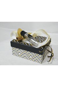 Bonita caixa retangular pequena em cartão "zig-zag" 8.5x11.5x5.8cm, recheada com 200gr de deliciosos ovinhos de chocolate . Decorada com lindo laço gravata em fitas tecido nos tons beije, um pau de canela, folhas douradas e uma útil rolha anti-gotas.